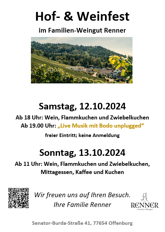 am zweiten Oktoberwochenende, dem 12. und 13. Oktober findet unser Wein- und Hoffest im Familien-Weingut Renner statt.