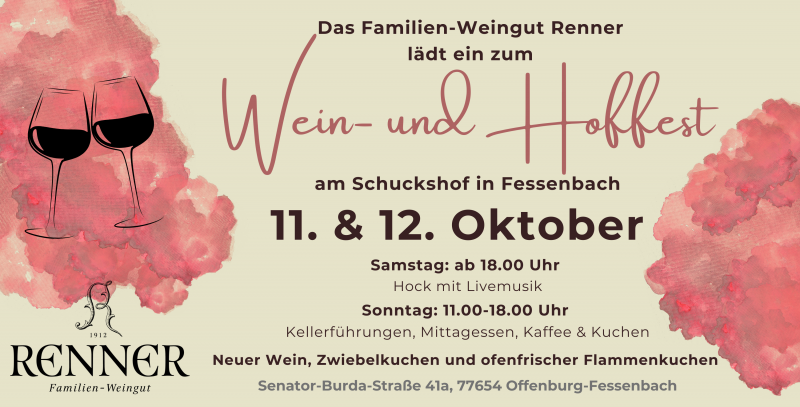 Am kommenden Wochenende, Samstag den 11 und Sonntag den 12. Oktober findet unser Wein- & Hoffest im Familien-Weingut Renner in Offenburg-Fessenbach statt.